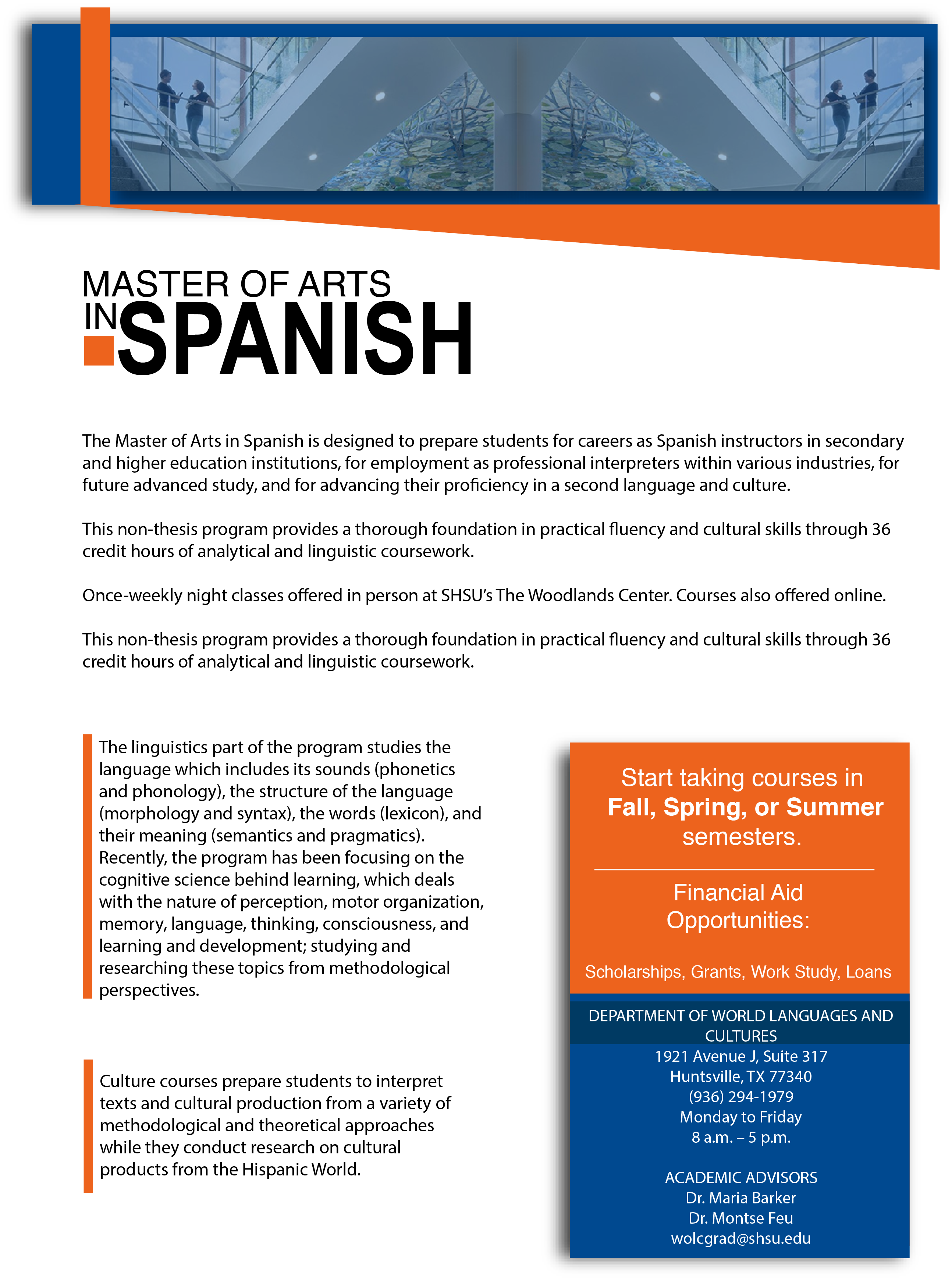 MA IN SPANISH Home ... Academics Foreign Languages Menu M.A. in Spanish Degree Plan | Application Requirements | Guide to Comprehensive Final Exams | Online Student Orientation | Graduate Scholarships | Graduate Catalog | Event Calendar | MA in Spanish Handbook