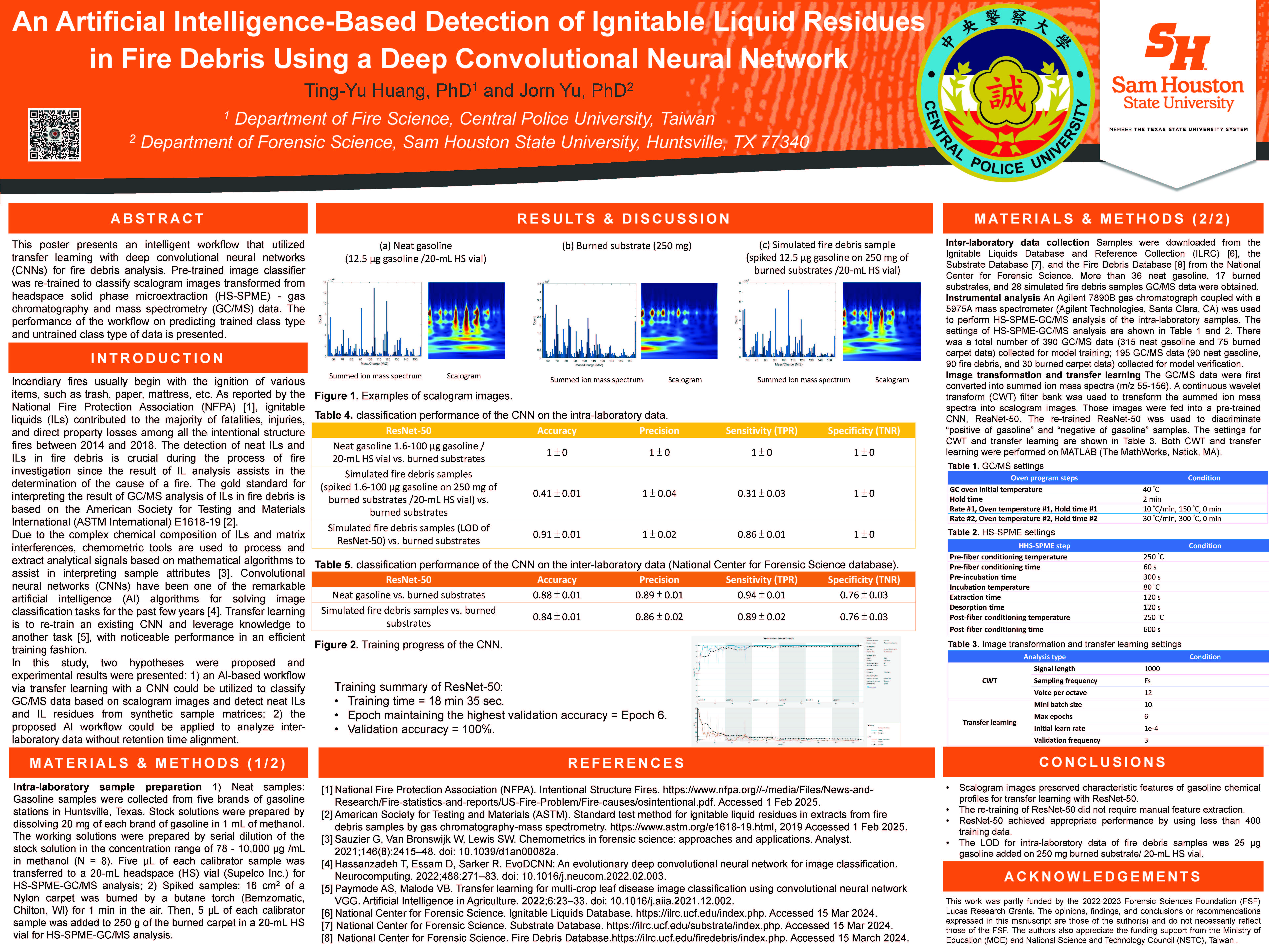 Ting-Yu Huang presented a poster entitled "An Artificial Intelligence-Based Detection of Ignitable Liquid Residues in Fire Debris Using a Deep Convolutional Neural Network".